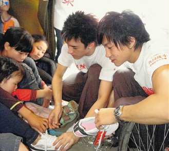 何潤東給小朋友們送鞋子。