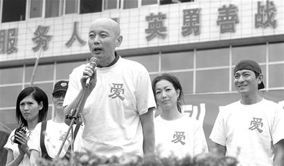 作為活動(dòng)的發(fā)起人——四川女婿張國立用四川話鼓勵(lì)大家:“大家辛苦了!地震雖然摧毀了我們的家園,我們可以建設(shè)更好的家園,天災(zāi)雖然無情,但是我們?nèi)硕加星。我們一起喊四川加油!四川雄起哈!”現(xiàn)場(chǎng)每一個(gè)人都高舉右手,高呼:“四川加油!四川雄起!” 記者馬丹 攝影劉亮
