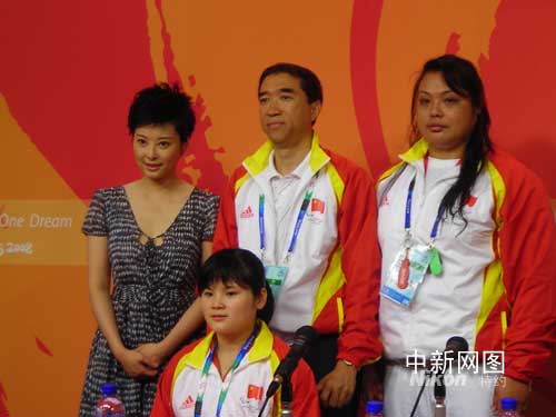 袁立(后左一)、中國代表團副團長盛世國(后左二)、殘奧舉重冠軍肖翠娟(后左三)、殘奧盲人柔道冠軍袁艷萍一起合影。