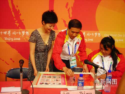 簽名紀念:袁立(左一)中國代表團副團長盛世國(左二)殘奧盲人柔道冠軍袁艷萍。