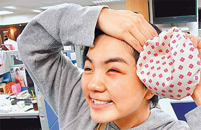 她左眼立刻腫起及嚴(yán)重瘀青,她回家后不斷冰敷,還慶幸:“只差一點,就打到眼球,好險!”樂觀的她昨進所屬華研音樂辦公室,還大喊:“快來看團團圓圓,來我這里看貓熊免排隊喔!”不過她現(xiàn)在最擔(dān)心周五預(yù)定要拍廣告,目前左眼的瘀青沒把握來得及消褪,華研表示若屆時傷勢未痊愈,只好跟廠商協(xié)調(diào)延期拍攝。