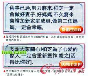 張柏芝在短信中暗示自己從來(lái)沒有退出并有意重返娛樂(lè)圈工作,更表示“一定會(huì)一家幸福快樂(lè)”,甚至留言“舊事已過(guò),努力將來(lái),柏芝一定會(huì)做好妻子、好媽媽,不久將來(lái)會(huì)增加新家庭成員,一定會(huì)幸!。