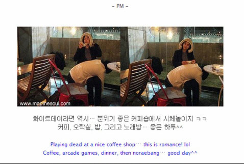 Tablo在上傳照片后,還寫了照片說明。他寫到:“白色情人節(jié),理應(yīng)在氣氛浪漫的咖啡屋裝出死人的樣子,呵呵,咖啡、娛樂室、吃飯,還有練歌房,快樂的一天^^!被仡櫫水(dāng)時(shí)幸福的樣子。