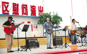 得知“心連心”前來演出,不大的擂鼓鎮(zhèn)廣場擠滿了 5000多名從四處趕來的北川人。上午9時,在導(dǎo)演兼主持人馬東的“吆喝”中,央視名嘴王小丫、張澤群、董浩、撒貝寧、韓喬生樂一一亮相,分別為災(zāi)區(qū)人民送上一句祝福。而最難得的場面是平時說比唱多的央視名嘴齊秀唱功。不過最搞笑的當屬“韓大嘴”,他一發(fā)聲,調(diào)不知跑哪兒去了,頓時笑翻全場。接下來,鞠萍、趙保樂的《為了誰》,郭峰演唱的《勝利》,孫悅等人演唱的《好人好夢》和觀眾進行了臺上臺下的熱烈互動,把現(xiàn)場氣氛推向高潮。