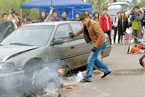 最驚險的一幕是車輛爆炸之時,雖然整部汽車都燃起了熊熊大火,卻未出現(xiàn)零件炸飛的情況。爆炸的道具十分簡單,是劇組自制的“汽油彈”———在幾個空瓶內(nèi)裝滿汽油,外加少許甲胺磷農(nóng)藥或白酒等物品,與幾個小“魚雷”捆綁在一起就能“爆炸”了。(記者 章琰)