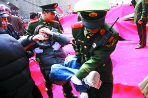 開機(jī)大典在一片鑼鼓和禮炮聲中拉開序幕。當(dāng)?shù)氐臄?shù)千名圍觀群眾剛開始還秩序井然,多數(shù)在遠(yuǎn)處旁觀。但是,隨著眾主創(chuàng)的陸續(xù)登臺亮相,人群中開始騷動(dòng)起來。盡管現(xiàn)場有人數(shù)頗多的保安維持秩序,但是都保護(hù)著明星和領(lǐng)導(dǎo),并沒有安排專人負(fù)責(zé)媒體席,令300多位群眾瞬間涌上原本只能容納百人的一米多高的簡易媒體臺。