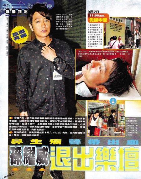 原本10月出唱片的孫耀威,上月忽然向所屬的環(huán)球唱片公司以聲帶不適為由,要求無(wú)限期押后錄音,并推掉一連串登臺(tái)工作。據(jù)知半年前,孫耀威發(fā)現(xiàn)每次表演后喉嚨便出現(xiàn)劇痛和紅腫,起初他以為是一般歌手常有的聲帶發(fā)炎,于是便戒酒救聲,但一直沒(méi)有好轉(zhuǎn),最近才被醫(yī)生證實(shí)是聲帶出血,每次唱歌都會(huì)引發(fā)聲帶微血管爆裂,喉嚨充血。聲帶出血將孫耀威的事業(yè)計(jì)劃全盤(pán)打亂,他原本計(jì)劃明年在臺(tái)灣出碟,如今都因病泡湯。