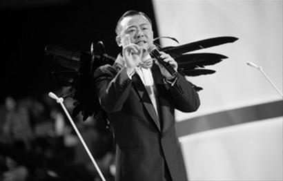 當(dāng)晚,周立波一身筆挺修身的黑西裝在舞臺上亮相,只不過背后“長”出了一雙黑色的羽毛翅膀,最搞笑的是,他居然提了個小板凳,然后直挺挺地站了上去,因為他周圍的美女個頭都比他高。“我今天的造型其實是個天使,但很多人說我像只烏鴉,但你們別把烏鴉不當(dāng)鳥,別把饅頭不當(dāng)點心!”