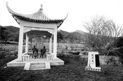 家族墓地是坐北朝南,正中間是侯寶林夫妻的墓地,有特色的是兩人的“棲息地”是在一個白色亭子里。老兩口的雕像各自“坐”在凳子上,悠閑地聊天、對望。