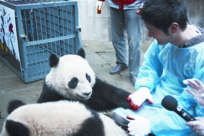 1月5日,“中國保護(hù)大熊貓研究中心熊貓愛心大使“黃曉明到雅安現(xiàn)場,替自己的一雙“兒女”送行。由他百萬認(rèn)養(yǎng)的地震后出生的全球首對雙胞胎大熊貓“平平”、“安安”這次就將以“哥哥”、“姐姐”的身份帶領(lǐng)另外八只熊貓遠(yuǎn)赴上海世博!捌狡健彼坪跻谎劬驼J(rèn)出了“爸爸”,邊吃著早餐,另一只手很自然的就搭在了黃曉明的腿上。 記者 黃麗娟