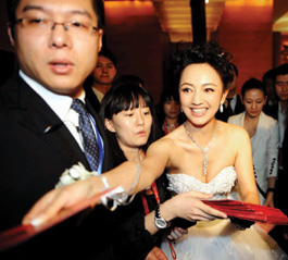 天后王菲的駕到,使得這場(chǎng)婚禮頗具轟動(dòng)效應(yīng),也許是王菲的星光太過(guò)耀眼,以至于隨后新郎和新娘、伴郎張楊、伴娘薛佳凝的露面都有些暗淡。