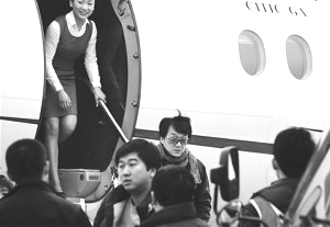 下午3:20,成龍的飛機降落在機場。幾名工作人員先行下機,警覺地四處環(huán)顧,一眼就看到了攝影記者手中的相機,立刻上前阻止:“成龍大哥沒有化妝,頭發(fā)很亂,還有白頭發(fā),你不能拍!