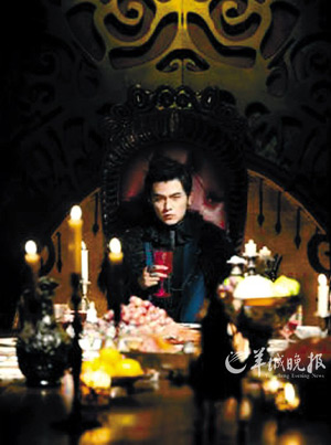 在新專輯預售海報上,周杰倫以一個中古世紀的吸血鬼扮相出現(xiàn)。只見他臉色蒼白,嘴唇鮮紅,穿一身西裝外套,還罩了一件羽毛披肩,坐在餐桌前若有所思,像是一個住在城堡中的神秘“吸血鬼王子”。造型師還在周杰倫的指甲貼上帶有鉚釘?shù)闹讣灼屛罩票氖至髀冻鋈A麗感;眼睛里則戴上了特殊的隱形眼鏡,營造出一雙“電眼”,眼里還有動物般的直立橢圓瞳孔,詭異得令人戰(zhàn)栗。