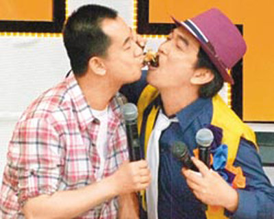 前晚兩人上《我猜我猜我猜猜猜》,介紹臺(tái)灣夜市很紅的小吃“海怪級(jí)章魚(yú)腳”,吳宗憲喂黃海波吃,但怕他咬不斷,主動(dòng)用嘴巴幫忙咬,差點(diǎn)男男吻。昨晚海清錄中視《新聞6一下》,體驗(yàn)當(dāng)主播,大嘆當(dāng)主播比演戲難太多。