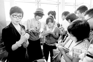 李瑞英還沒(méi)走兩步,就有幾名攝影記者躥到了她面前,拿起相機(jī)按了一通快門。李瑞英只好停下腳步,等攝影記者拍完后,再次向采訪區(qū)走。