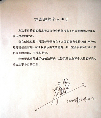 方宏進的聲明字數(shù)并不多,全文為打印字體,在文末空白處,方宏進簽上了自己的名字。一開頭,方宏進就道歉,“此次事件給我的親友和各方合作伙伴帶來了巨大的困擾,對此我表示深深的歉意!憋柺軤幾h的方宏進直言:“希望此事能夠盡快依法解決,讓涉及的企業(yè)和個人都能夠安心地從事各自的工作。”