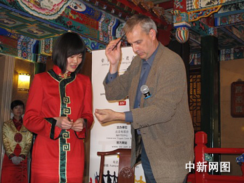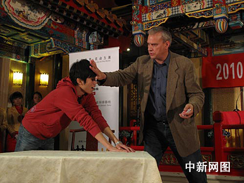 中新網(wǎng)11月25日電 昨天(24日),北京電視臺2010年“環(huán)球春晚”正式簽約美國著名魔術師大衛(wèi).威廉姆森儀式在北京全聚德烤鴨店舉行。和因春晚一炮而紅的劉謙一樣,來自美國的大衛(wèi)最擅長近臺魔術,被譽為是“魔術盛典靈魂人物”。在簽約儀式上,大衛(wèi)以他風趣幽默的個人風格和在場的魔術愛好者過招,在觀眾眼前近距離地用撲克牌和順手拿起的筷子展示了自己嫻熟的手法。