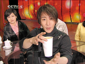 1.劉謙的魔術(shù)臺(tái)邊,赫然立著一桶某品牌的果汁。