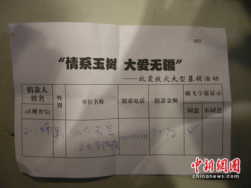 中新網(wǎng)4約0日電 今晚(4月20日)8時,《情系玉樹,大愛無疆——抗震救災(zāi)大型募捐活動特別節(jié)目》將在中央電視臺1號演播大廳舉行。過百演藝明星參與,在今天下午的排練現(xiàn)場,孫楠成為最早一批到達現(xiàn)場的歌手,并在第一時間捐出30萬現(xiàn)金,向災(zāi)區(qū)人民做出一份善舉。