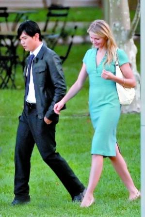 美國當?shù)貢r間9月5日,周杰倫在洛杉磯拍攝電影《青蜂俠》。好萊塢影星卡梅隆·迪亞茲身穿藍色連衣裙,與周杰倫邊走邊聊,非常親密。