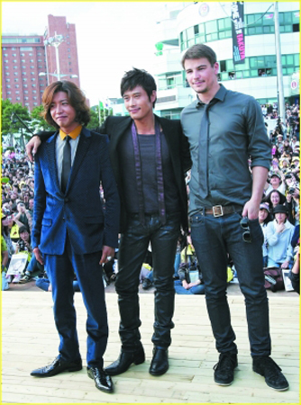 第14屆釜山影展開幕以來,喬許·哈奈特(下圖右)、李秉憲(下圖中)與木村拓哉無疑是最受矚目的3位帥哥,他們連續(xù)幾天都為新作《伴雨行》造勢。雖然木村拓哉自爆與李秉憲、喬許·哈奈特在酒店內(nèi)飲酒談心,并且他們還用了喝交杯酒的姿勢喝了很多杯。不過,有地主之利的李秉憲卻完全不顧“酒友”情,在三人同臺亮相時,腳蹬近5厘米高的鞋跟,站起來硬是比號稱176厘米的木村更高一點(diǎn)。