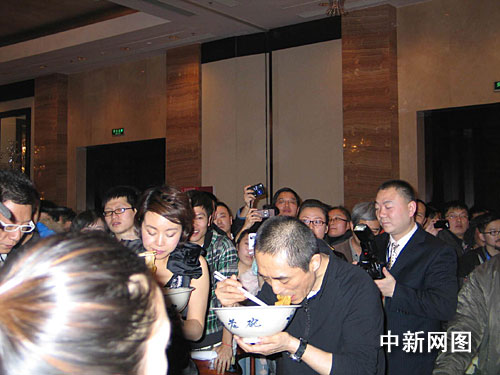 在《三槍》中,“高桌子低板凳都是木頭”的陜西話地道風(fēng)趣,熱氣騰騰的油潑面更讓中國各地觀眾頓生興趣。很多觀眾看完 《三槍》,第一感覺就是想來一碗熱辣辣的油潑面。影片結(jié)尾,所有人復(fù)活,一起狂吃油潑面,場面壯觀。而今天,張藝謀、孫紅雷、閆妮、小沈陽、倪大紅等主創(chuàng)也當眾“秀”了一把陜西油潑面。如《三槍》中的歌詞所唱:“吃碗油潑面,我保準就能啪啪地沖鋒向前”。