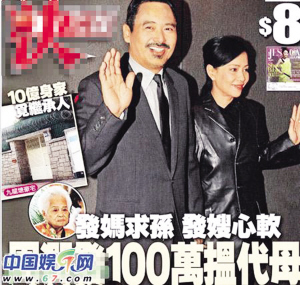 昨日有香港媒體報(bào)道,年屆九旬的發(fā)媽陳麗芳希望發(fā)哥能夠找代孕,為周家添后,一圓20多年的夙愿,同時(shí)也為周潤(rùn)發(fā)10億元的家產(chǎn)“制造”繼承人。據(jù)知,有人提出以一百萬(wàn)元代價(jià),在內(nèi)地尋覓優(yōu)質(zhì)代母,務(wù)求一擊即中。