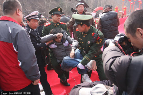 下午1時50分左右儀式開始,陳凱歌上臺發(fā)言后,在場圍觀民眾為爭看明星開始出現(xiàn)擁擠,約300民眾涌上一個高約一米、專為記者拍攝而設(shè)的木制看臺。大約三分鐘后,看臺疑不堪負(fù)重,突然倒塌。在前排拍攝的記者如滾地葫蘆般墜地,三角架、攝影機倒地?fù)p毀。在場的公安、武警將受傷的10名記者抬離現(xiàn)場,送院救治。