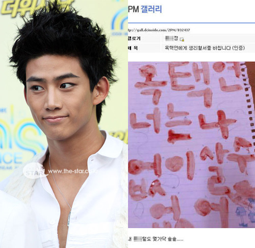 “朝鮮日報(bào)”消息,上月28日在社交網(wǎng)站DCInside的2PM圖庫中,一名會員上傳了寫有“玉澤演你沒有我就活不了”的血書。一些網(wǎng)民看到后懷疑“是不是用紅墨水寫的假血書?”對此,上傳這份血書的粉絲表示“我說到做到”,并公開了染血的內(nèi)衣。