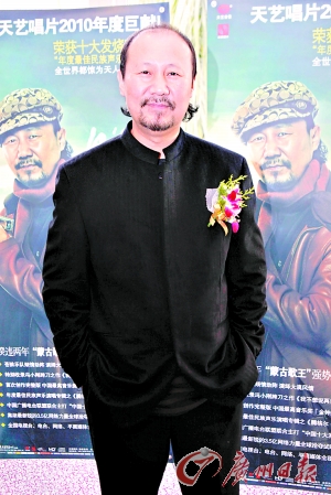 昨天,帶著暌違兩年多的新專輯《云中的月亮》來到現(xiàn)場的“蒙古歌王”騰格爾最受媒體關(guān)注。和以往的風格不同的是,新專輯海報和唱片封面上的騰格爾身穿皮衣,頭戴一頂鴨舌帽格外扎眼。在接受采訪時,騰格爾笑著說這張專輯除重新編配了一些老歌,主要是他近兩年來的新作,少了些蒙古味,多了點時尚感,而封面新造型也同樣是一次大膽嘗試!罢麖垖]嬘6首詞和8首曲都是我自己寫的,和以往相比,這張新作比較大眾化。”