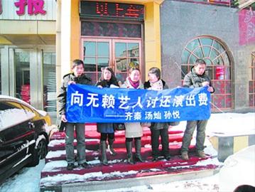 昨日上午,沈陽一文化公司的5名員工在北三經街鬧市區(qū)拉出條幅:“向無賴藝人討還演出費!”條幅下列出了三名藝人的姓名:齊秦、湯燦、孫悅。