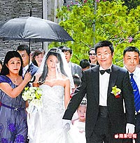 昨早9時(shí)男方以6輛奔馳車隊(duì)至女方家迎娶,親友幫新娘撐的卻是黑傘,依民間習(xí)俗,一般新娘出嫁時(shí),親友會(huì)以米篩遮陽,如果是撐黑傘,多半意味新娘腹中有喜。問新人是否有喜時(shí),他們只說“謝謝”,未正面回答。證婚人鳳凰衛(wèi)視主席劉長樂入場時(shí),被媒體問:“小孩是男的?女的?”他也未作答。