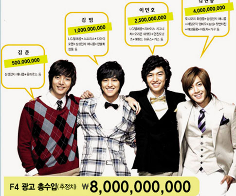 李民浩、金賢重等《花樣男子》主演們也身價倍增,“韓版F4”的各種廣告收入加起來已經超過了80億韓元。