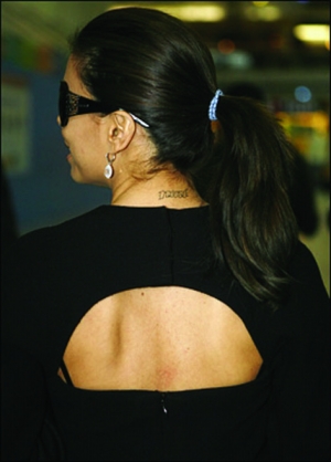 愛的文身,這一招早就不新鮮了。不過,在三級(jí)片、性丑聞這樣的陰影之下,“瘋狂主婦”伊娃還是使出了這一招,文的是她球星老公托尼的球衣號(hào)碼9(NINE)。最近她和辣妹維多利亞走得很近,估計(jì)是偷學(xué)了一招。