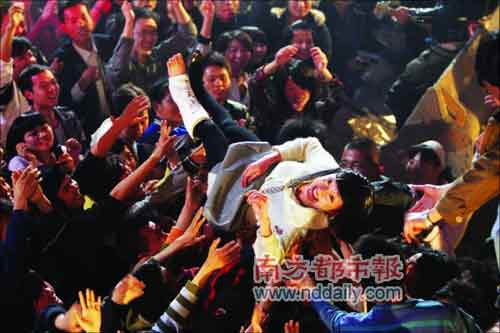 周迅在片中號(hào)稱飾演12個(gè)角色,當(dāng)天她的戲份卻非常獨(dú)特:在搖滾演唱會(huì)現(xiàn)場(chǎng),人群中忽然躁動(dòng)起來,歌迷以搖滾演唱會(huì)上最常見的人體輸送帶的方式將她傳送到了舞臺(tái)上!而周迅的腳上竟然打著石膏繃帶。