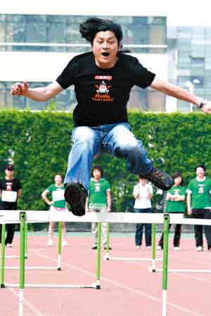 導演張揚穿牛仔褲跨欄 英姿勃發(fā)不輸劉翔(組圖)