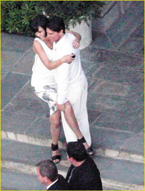 湯姆·克姆斯與凱姆·霍爾姆斯去年以3500萬美元(約合人民幣2億4500萬元)購入比弗利山豪宅,上周末舉行盛大的新居入伙派對,請來逾500人出席,包括貝嫂維多利亞、靚太伊娃、名嘴奧普拉等。穿上白色情侶套裝的靚佬湯與凱蒂,在派對開始前站在大屋門外迎賓,兩人興奮得以探戈舞的姿勢拍照。整個派對有8名警察指揮交通,亦有一部救護(hù)車與醫(yī)療隊候命。靚佬湯更重金禮聘奧斯卡主廚沃爾夫?qū)づ量酥骼硎澄,又有樂隊演奏,?shí)屬五星級派對。