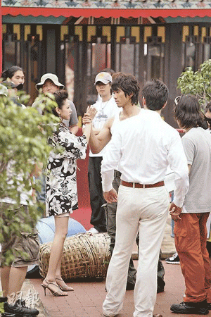 據(jù)香港《明報》報道,由于韓劇《伊甸之東》劇組要保持劇集內(nèi)容的神秘,故記者采訪時要保持遠(yuǎn)距離。不過現(xiàn)場得見,宋承憲的“掃地”裝扮也有型過人,白色背心與軍褲,展示健碩身形。而跟他有對手戲的Zoie也被其電眼電暈,不敢與他對望。