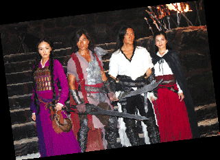 走進(jìn)一間已經(jīng)被布置成刑房的攝影棚,巖石碎塊構(gòu)成了粗糙的地面,幾把劍插成了劍壇,臺階上火爐冒著火苗,空中還懸著幾塊爬著蟲蛆的火腿,幾臺鼓風(fēng)機(jī)正開足馬力吹著風(fēng)……看前面,一堆人正在你推我一把,我攻你一招,原來替身正在幫任達(dá)華試戲。對披著長發(fā)造型的鄭伊健、郭富城以及何家勁來說,炎熱恰是專門跟耍帥作對的。問到郭富城對于造型的看法,郭富城當(dāng)即冒出一句“非常熱”,F(xiàn)場汗流浹背的阿Sa抱怨說,飾演聶風(fēng)的鄭伊健可謂是片中最舒服的一位,不僅戲服相對清涼,由于名為“風(fēng)”,因此拍戲的時(shí)候可以充分享受鼓風(fēng)機(jī)的待遇。
