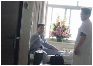 半個多小時后,一位醫(yī)生例行查房推開了任程偉的病房門,站在走廊里的記者看見任程偉身穿病號服斜躺在病床上,氣色有些灰暗,神情憔悴,雙腿好像不能動彈。他回答醫(yī)生問題時聲音也很微弱,與他前不久登臺領(lǐng)獎時神采飛揚的樣子簡直判若兩人,而醫(yī)生則一直在勸慰任程偉。醫(yī)生走后,病房里傳來了一陣手機鈴聲,任程偉強打精神地通著話,臉上露出勉強的笑容,通話結(jié)束后,他就疲倦地倒在了床上,熒屏上的硬漢此時看上去特別虛弱。隨后記者撥打任程偉的電話,電話已經(jīng)關(guān)機,而他經(jīng)紀(jì)人的電話也已轉(zhuǎn)到秘書臺,截至發(fā)稿時任程偉的病情還沒有得到進一步的證實。 卓偉