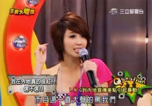 28日,臺(tái)灣綜藝節(jié)目《王牌大賤諜》播出主題為“在外地比臺(tái)灣紅的藝人”訪談。女子組合I.N.G在節(jié)目中公然宣稱自己在大陸很紅,并夸張講述大陸歌迷的追星情節(jié),同時(shí)嘲笑大陸的衛(wèi)生習(xí)慣和飲食風(fēng)俗。節(jié)目播出后,大陸網(wǎng)友紛紛表示憤慨,集體攻擊I.N.G論壇和貼吧,并聯(lián)名要求封殺該組合。