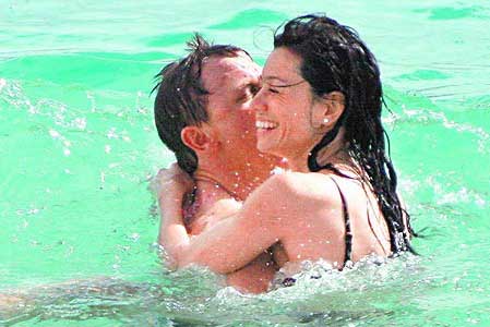 丹尼爾穿四角泳褲,與米歇爾在水中摟摟抱抱、玩親親,上岸后躺在沙灘仍上演007的老梗情節(jié),他撫摸她性感身軀,熱吻纏綿。他的身材較之前拍片時(shí)顯得略微松垮,仍算維持得不錯(cuò)。