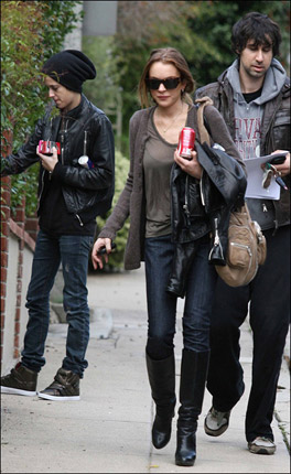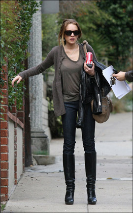 情人節(jié)當(dāng)天和同性女友 Samantha Ronson大吵架的林賽·羅韓好像已經(jīng)緩和了,兩個(gè)人被拍到在紐約街頭。當(dāng)天的林賽實(shí)在是范的不一般,咖啡色的開身毛衣,搭配里面的半透明的咖啡衣服,內(nèi)衣若隱若現(xiàn)性感非常,下身則是緊身的深藍(lán)色牛仔褲黑色的高跟靴子,襯得雙腿修長。最重要的是手里的黑色機(jī)車服,這個(gè)道具已經(jīng)出現(xiàn)在很多明星的手里了,看來想讓機(jī)車服不熱都不成了。