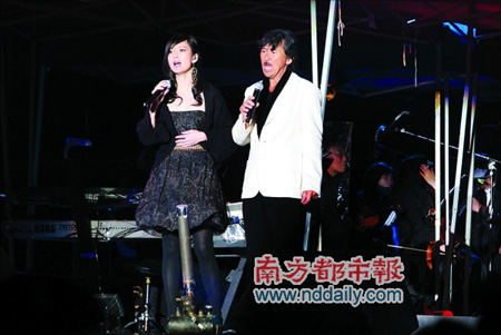 前晚廣州的氣溫跌到6攝氏度,再加上連綿小雨,的確是一個“打狗都不出門”的天氣。而演唱會在上座率不足三分之一的情況下,終于在延時20分鐘后開場了。林子祥(阿lam)一出場就是一首氣勢奪人的《男兒當自強》,可是“熱血熱腸熱,熱勝紅日光”的歌詞,卻沒能讓觀眾馬上投入,一曲完畢,掌聲弱不可聞,歡呼聲同樣寥落。演唱會幾乎就在同樣的氣氛中進行了大半場,無論是阿lam本人主動走到臺下與觀眾握手,還是嘉賓盧冠廷的出場,甚至是同樣作為嘉賓上臺的玉女周慧敏以“大家如果更熱情點,我會覺得暖些”,暗示有可能將罩在低胸小禮服外的外套脫掉,都無法徹底調動起龜縮在大衣下的觀眾的情緒,短暫的小高潮過去,轉瞬又歸于平靜。