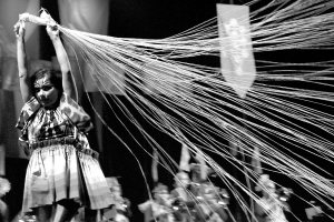 演出期間,比約克一度化身“蜘蛛女”,身著五彩斑斕的演出服展現(xiàn)“吐絲”一幕。而演唱會(huì)的下半部分簡直是在比約克和歌迷的熱歌熱舞中進(jìn)行的。圖/陳強(qiáng)華