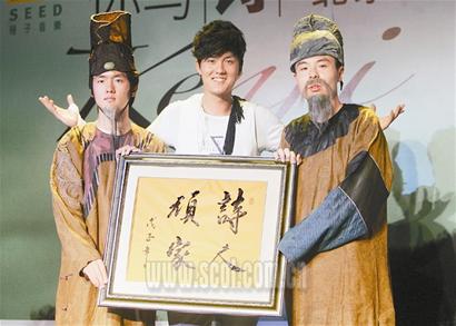因?yàn)榕c“詩(shī)”有關(guān),在昨日的發(fā)布會(huì)上,最先上場(chǎng)的不是主角吳克群,而是“穿越時(shí)空”前來(lái)捧場(chǎng)的中國(guó)古代先賢:最著名的大詩(shī)人“李白”、“杜甫”。在現(xiàn)場(chǎng)所有人的驚呼聲中,兩位年輕演員所扮演的大詩(shī)人,卻顯得心神不定,他們鋪墊說(shuō):“得知今天有一位學(xué)貫古今、又能寫詩(shī)、又能唱歌的當(dāng)世才子即將到來(lái)。”這時(shí),吳克群才現(xiàn)身,并為兩位詩(shī)人解開了疑惑,還慨然應(yīng)允“李白”、“杜甫”來(lái)考驗(yàn)他,即興將兩位詩(shī)人的名句用吉他彈唱出來(lái)。吳克群的才華讓兩位“先賢”頻頻點(diǎn)頭,并當(dāng)場(chǎng)宣布吳克群為“詩(shī)人頑家”并送上金匾。