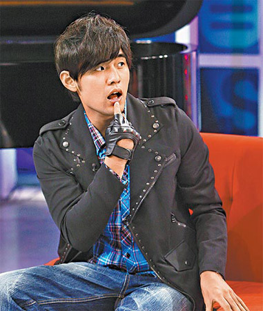在新專輯封面化身奇幻戰(zhàn)士的周杰倫,昨錄像時露出逗趣表情。