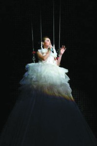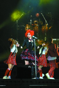 張靚穎與生俱來的不僅是她那副“靚嗓”,還有后天難以培養(yǎng)的藝人氣質(zhì)。能歌的張靚穎昨晚還表現(xiàn)出了善舞的一面,動作的協(xié)調(diào),節(jié)奏的把握,與舞群的配合默契而又出挑,當她帶領(lǐng)著舞群踩著節(jié)拍分別走向舞臺兩側(cè)向觀眾致意,頗有大牌風(fēng)范。而當她戴著一頂紅發(fā),穿著紅色格子短裙亮相時,立刻讓人聯(lián)想到了之前剛在同一場地開唱的日本歌壇天后濱崎步,兩人的造型極其相似,甚至連舞蹈動作都如出一轍。而在演唱新歌《那不是愛吧》時,張靚穎教了場下歌迷一段“手勢舞”,現(xiàn)場氣氛立刻活躍起來,而這也是濱崎步的“專利”產(chǎn)品,早在上世紀90年代,她就開始在演唱會中使用,其實就是電影《浪漫櫻花》中“ParaPara舞”的簡化版。昨晚讓“涼粉”大感驚喜的是,張靚穎竟帶了一個DV上臺,通過高倍變焦就可看清楚臺下歌迷的臉。然而,就在前兩周,凱莉·米洛的北京和上海演唱會上,凱莉就使用了同樣的橋段拉攏歌迷。昨晚最吸引眼球的還屬吊在半空中的張靚穎“穿著”一條十米長裙的驚艷亮相,其實,這一創(chuàng)意也早在2005年的莫文蔚香港和內(nèi)地演唱會上就使用過,并由菲拉格慕的設(shè)計師親手打造,盡顯大氣華貴。