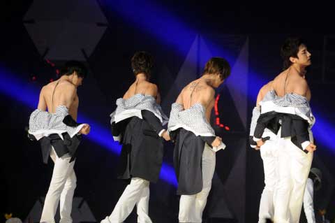 29日下午,“2008 SBS歌謠大典”在京畿道一山國(guó)際展覽中心(KINTEX)進(jìn)行了現(xiàn)場(chǎng)直播。節(jié)目當(dāng)天,東方神起在上臺(tái)演唱熱門歌曲《咒文》(MIROTIC)時(shí),在結(jié)尾處齊齊脫去上衣亮出了有型背肌,引得現(xiàn)場(chǎng)粉絲尖叫連連。