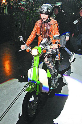 中新網(wǎng)1月12日電 創(chuàng)作歌手陳綺貞前晚在臺北小巨蛋的首場演唱會吸引1萬名粉絲,昨晚第2場依舊座無虛席,她一共換穿5套衣服,除了報童裝、軍裝,還以安全帽、皮衣打扮,騎上價值40萬元(新臺幣,下同)的復(fù)古機車,演唱新歌《魚》時又換上有閃閃鱗片的洋裝,化身美人魚。